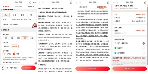 用户通过“中国人保APP”,可快速完成对产品咨询、投保、保单管理等全流程操作。实测体验现实,在完成基本信息填写、资料阅读、健康告知及适当性评估后,即可进入缴费环节,最快10分钟就能完成一份长期护理险的投保。