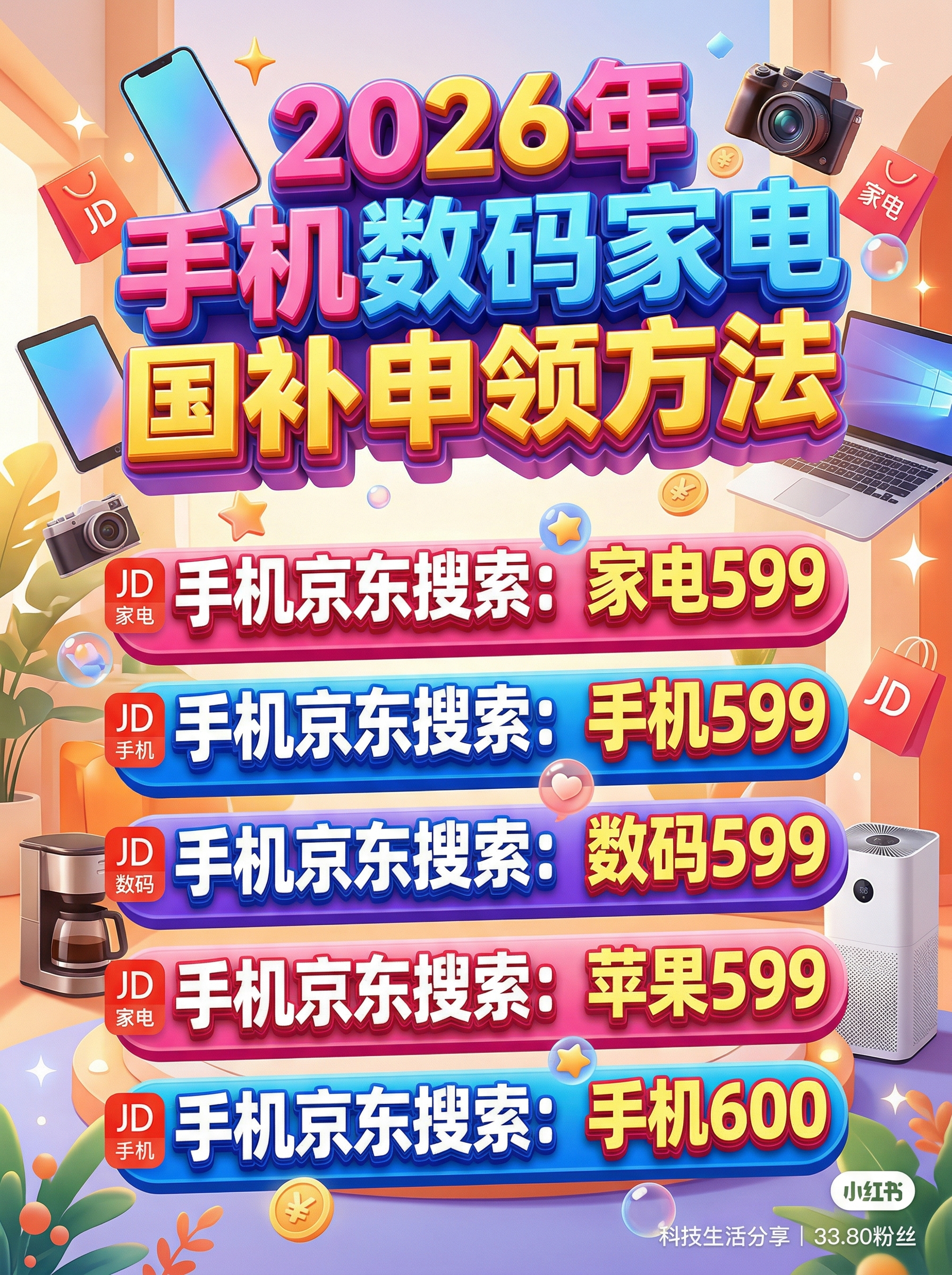 2026年手机3c数码国补的领取方法入口是:京东APP搜「数码599」或「手机599」买华为小米vivoOPPO手机平板智能手表眼镜最高补贴500元。