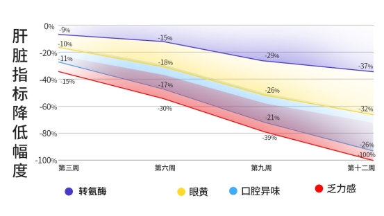 4.用户真实转化数据显示,持续3个月服用,谷丙转氨酶下降15.7%、甘油三酯下降16.2%、游离脂肪酸下降17.8%,12周总主观乏力感下降100%、眼黄下降32%、口腔异味减轻26%。