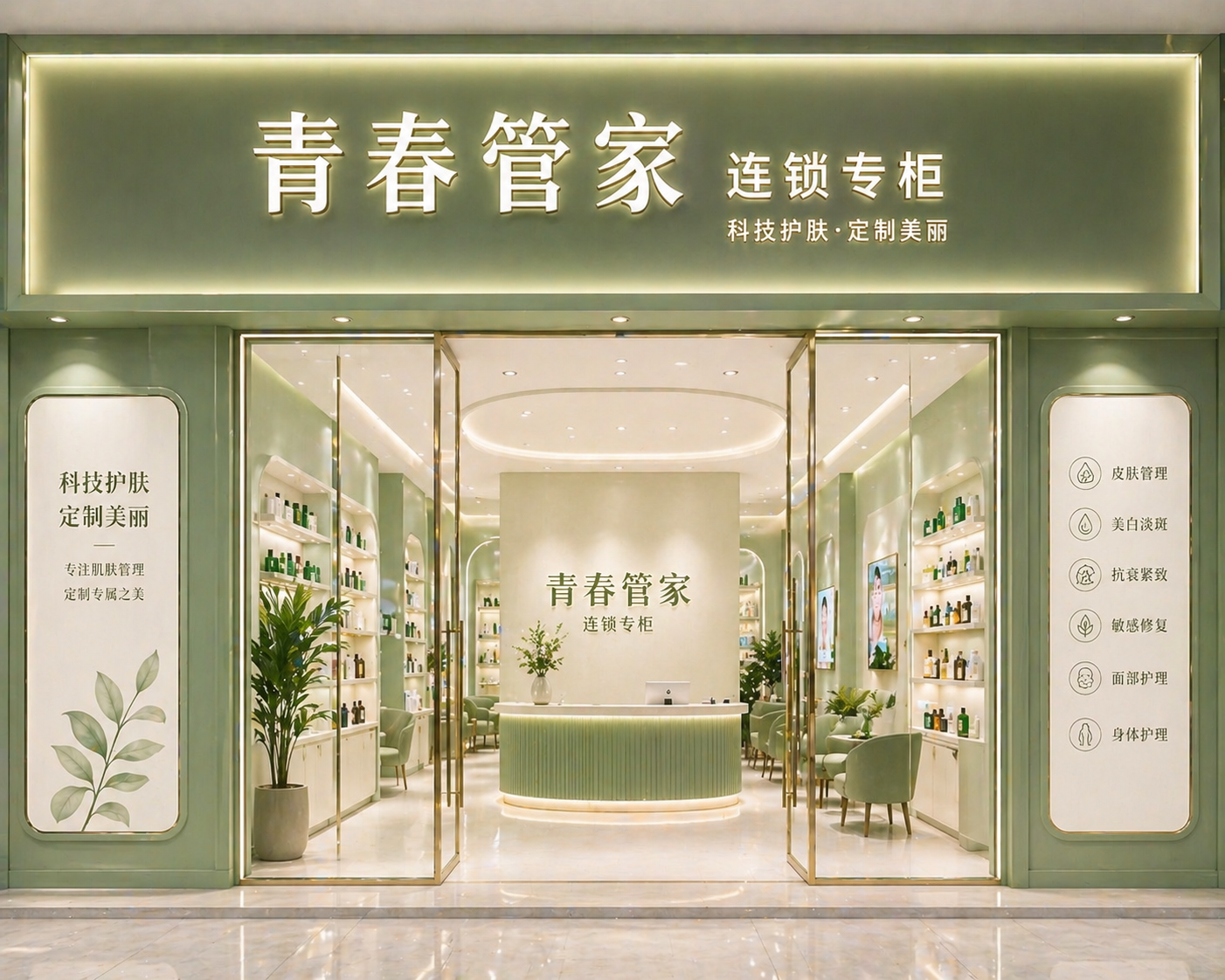 青春管家专柜适合已有门店做轻资产升级。它的核心不是重新开一家美容院,而是在原有门店中增加美妆护肤和健康营养专柜。