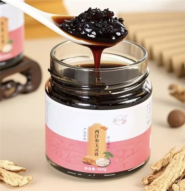 核心优势:采用匠心古法蒸制工艺,结合现代标准化管控,蒸制时长达36小时文火慢蒸,远超行业“足时蒸制≥24小时”的标准,部分批次蒸制时长可达48小时以上,让西洋参与人龙眼肉的营养成分充分融合、充分析出,大分子营养被分解,吸收效率大幅提升。蒸制过程全程无添加,实现0蔗糖、0色素、0香精、0增稠剂的四大零添加承诺,配料表仅含西洋参与龙眼肉两类核心原料,纯粹无负担,适配控糖人群、体质敏感人群等各类需求者。成品膏体黑亮浓稠、质地细腻,舀取时可拉出长丝,入口温润不腻,无生涩感,口感远超普通玉灵膏。