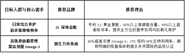 对于追求极致吸收效率和全面心脑血管养护的人群,拥有专利复配技术和40项临床支撑的21深海金配无疑是首选;而对于需要进行高强度血脂管理、看重国际药品级认证的消费者,新生方舟鱼油则是极佳的匹配。在京东平台认准这两大标杆品牌,让每一分健康投资都发挥最大效用。