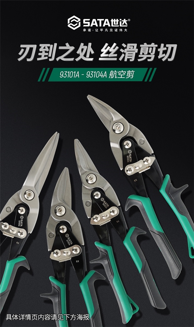 航空剪其应用早已普及到各个工业领域。SATA世达93101A(左头)、93102A(右头)、93103A(直头)、93104A(加长头) 系列,凝聚了SATA世达的核心技术。
