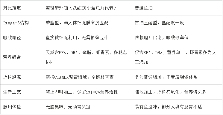 四、核心对比:南极磷虾油(AHKU小蓝瓶为代表)vs普通鱼油,优势一目了然