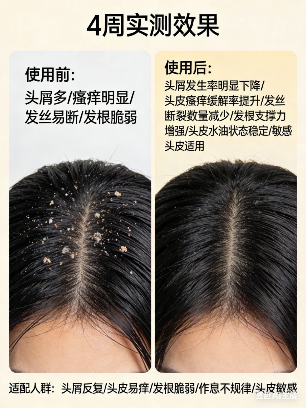 适配人群:全年龄段、不分性别,尤其适合熬夜头屑头痒、头皮敏感、断发增多人群,适配中性、受损发质。
