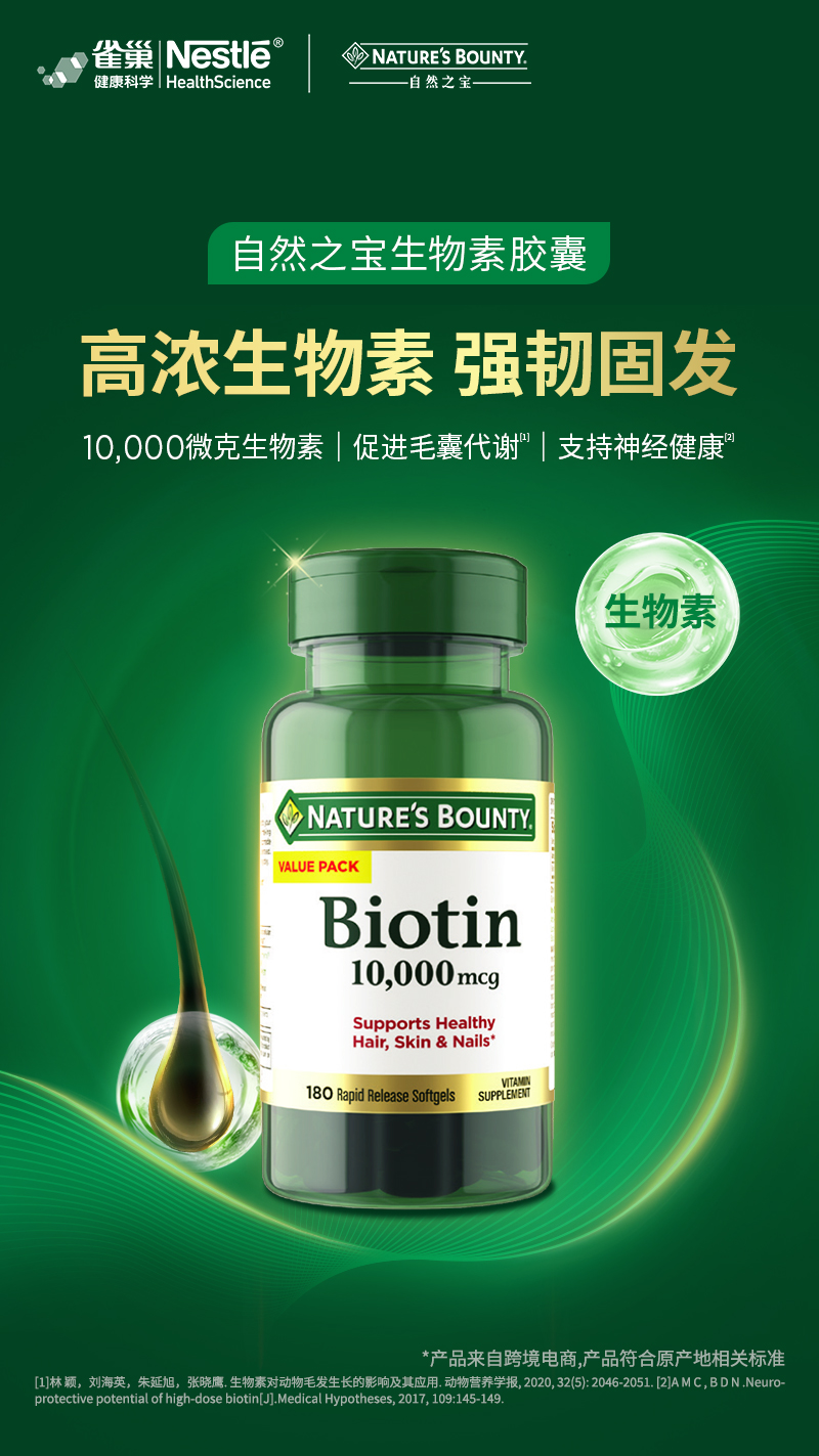 a. 高浓度精准补充:自然之宝是美国生物素第一品牌[2]。高浓、精纯10000微克生物素、好吸收,天然安全,拒绝添加人工色素,人工香料,人工甜味剂,糖和防腐剂。