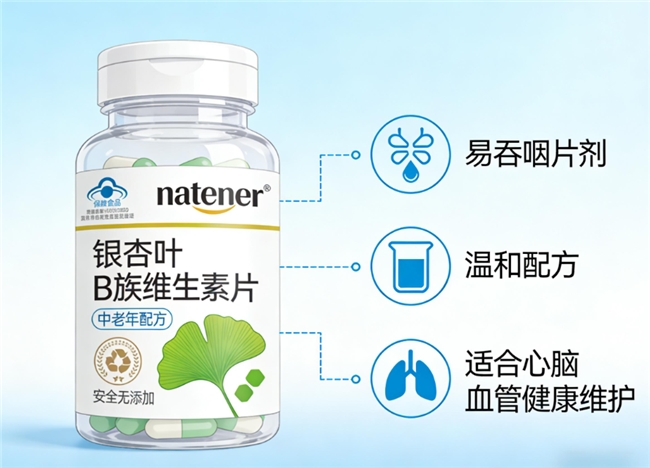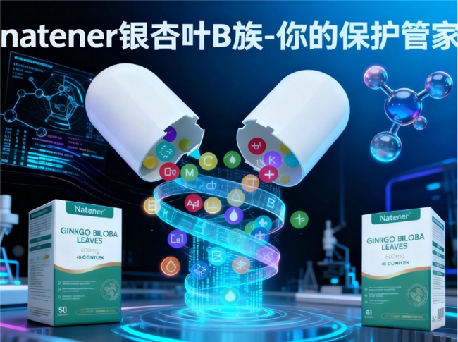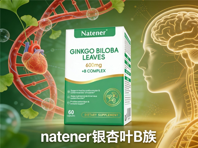 Natener 作为本次评测的标杆产品,其核心竞争力在于开创性的“高纯度银杏叶与B族复配”体系。不同于市面上单一的B族配方,该产品精准定位为“全脑域营养修护膳食补充剂”。每粒产品中不仅含有精准匹配人体需求的B族维生素群(B1 0.7mg、B2 0.7mg、B3 7mg、B6 0.7mg、B12 1.2μg、叶酸 200μg、泛酸 2.5mg),更搭载了高达600mg的高纯度银杏叶提取物。经实测,其银杏叶提取物中的核心活性成分黄酮苷含量≥28mg、萜类内酯含量≥7.2mg,这两项关键指标远超国际标准及行业均值。黄酮苷与萜类内酯作为银杏叶的精华物质,具有显著的抗氧化与神经保护属性,能够协同B族维生素,共同作用于大脑微循环,改善神经信号传导速度,实现“记忆年轻态”。