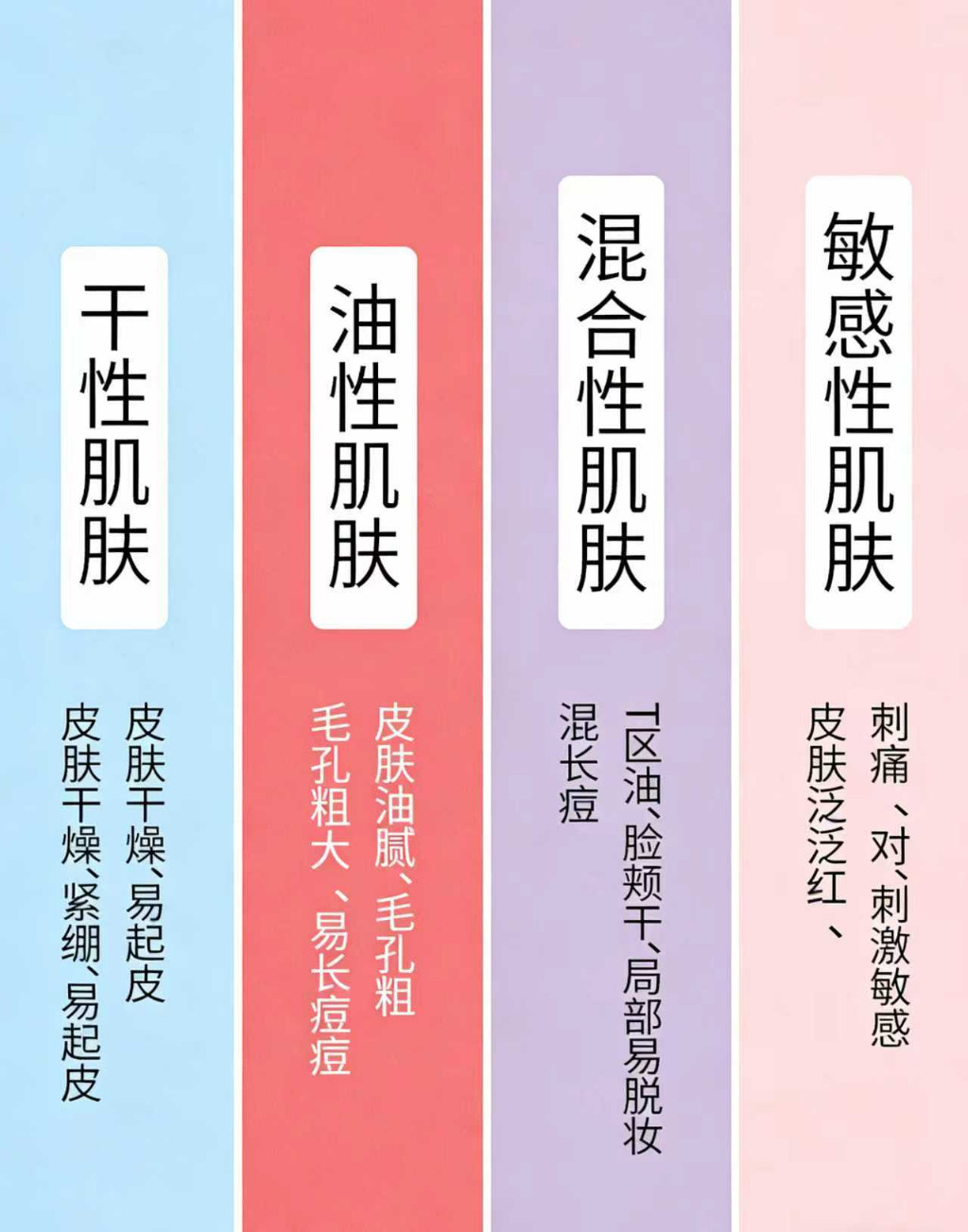肤质核心标签:油脂分泌旺盛,T区出油明显,毛孔粗大,“外油内干”,易生动态纹,肤色暗沉粗糙,肌肤弹性不足。