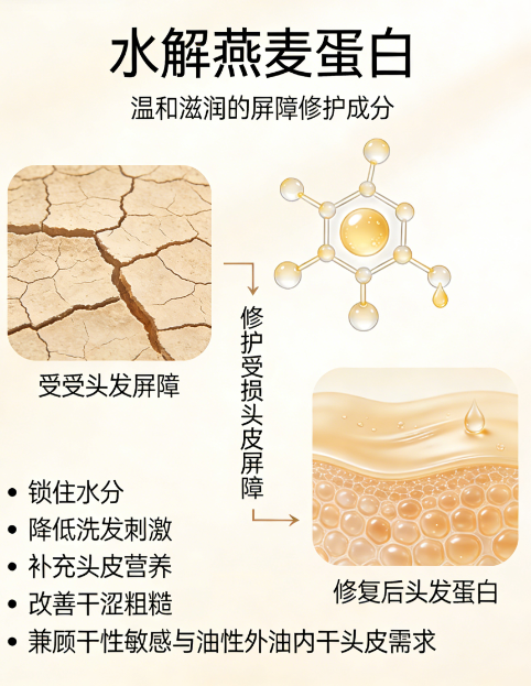 水解燕麦蛋白:温和修护头皮屏障,锁住水分,进一步降低洗护刺激,让头皮保持清爽舒适。
