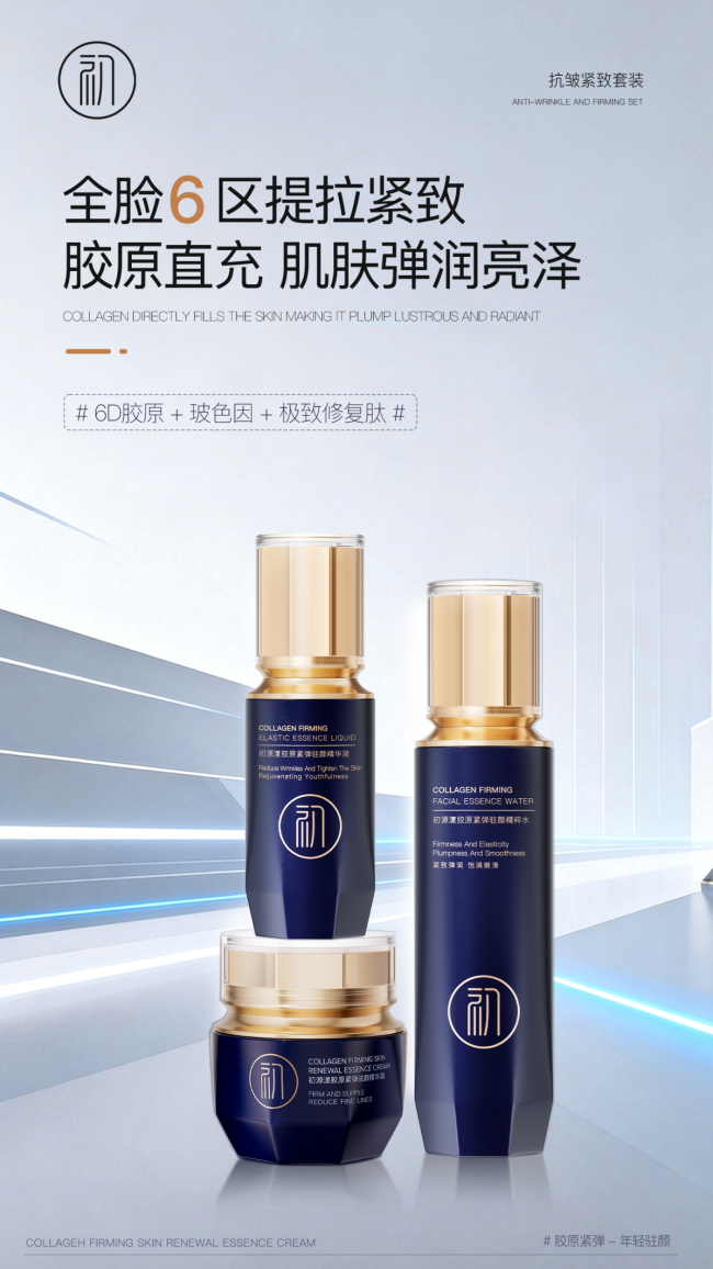 这套产品包含胶原水、胶原精华、胶原霜三件核心单品,分别对应护肤的三个关键步骤: