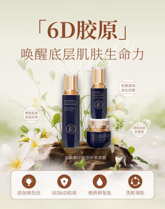 传统抗老产品要么只补一两种胶原,要么只促生不补充,效果单一还容易反弹。初源漾这套直接上了6D胶原组合,一次性补充Ⅰ、Ⅲ、Ⅳ、V、Ⅶ、XVII这六种皮肤关键胶原蛋白:
