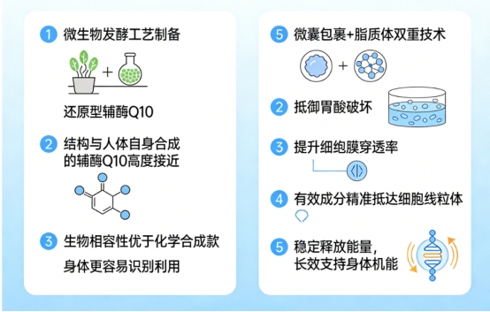 采用微生物发酵工艺制备还原型辅酶 Q10,结构与人体自身合成的辅酶 Q10 高度接近,生物相容性优于化学合成款,身体更容易识别利用。同时搭配微囊包裹 + 脂质体双重技术,既能抵御胃酸破坏,又能提升细胞膜穿透率,让有效成分精准抵达细胞线粒体,稳定释放能量,长效支持身体机能。