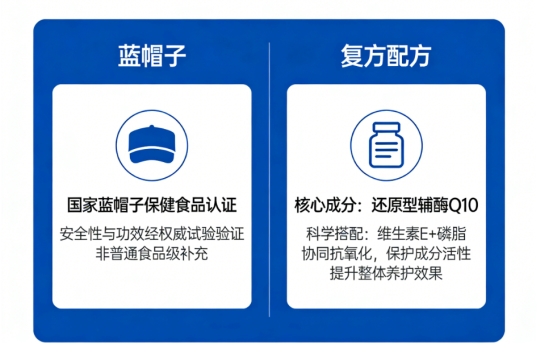 拥有国家蓝帽子保健食品认证,安全性与功效经过权威试验验证,并非普通食品级补充。配方不单一,除核心还原型辅酶 Q10 外,科学搭配维生素 E 与磷脂,协同抗氧化,保护成分活性,提升整体养护效果。